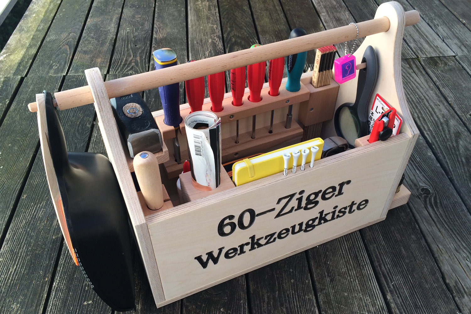 Holzwerkzeugkiste als Geburtstaggeschenk mit persönlicher Beschriftung